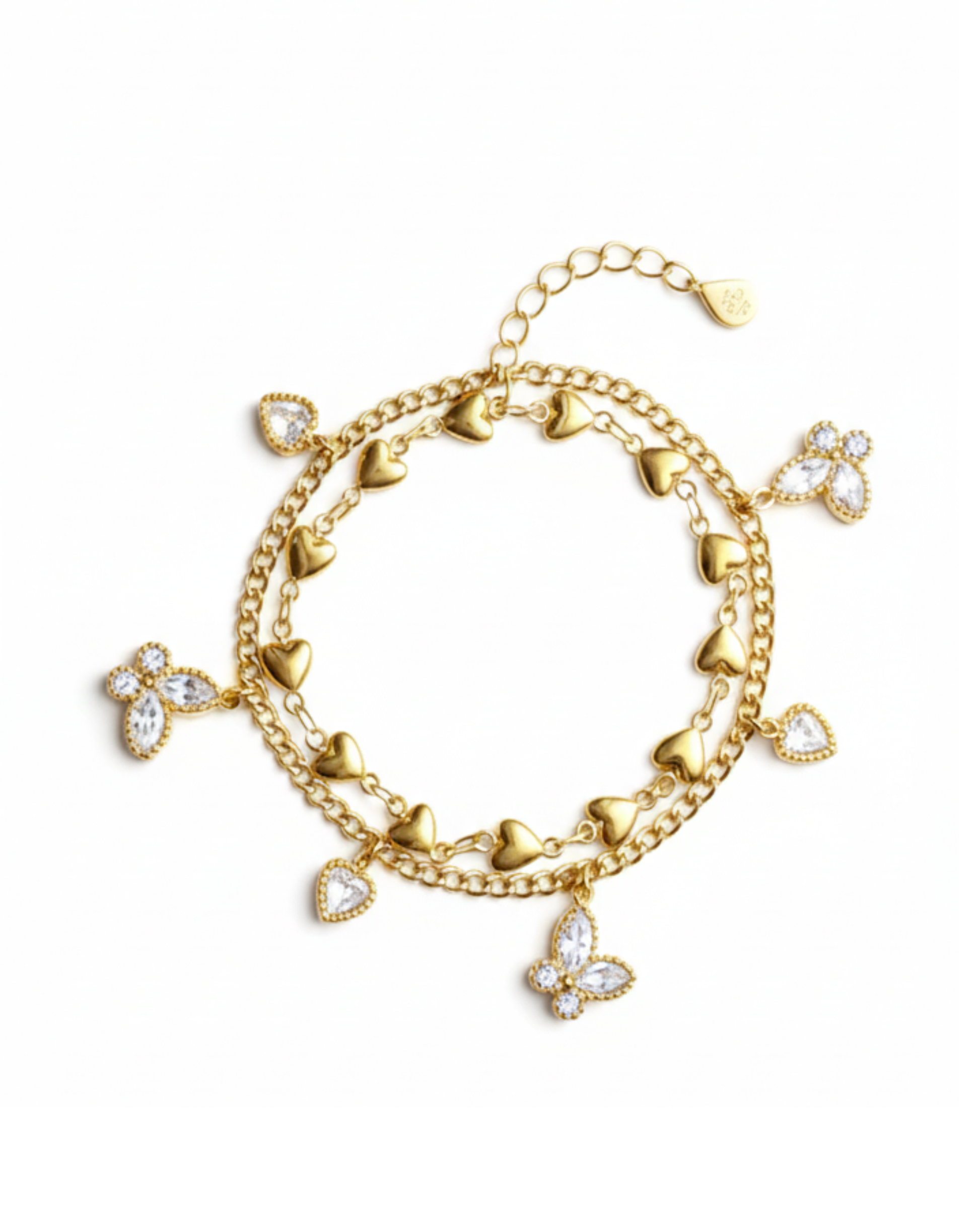Layered gold bracelet featuring heart and butterfly charms